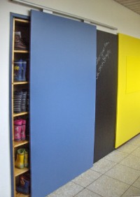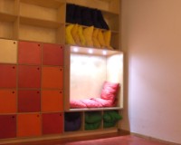 Einbau einer Schrankwand mit Individualfächern für die Kindergartenkinder und beleuchteter Vorleseecke